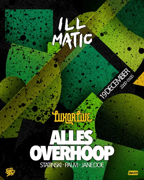 Illmatic De naam Illmatic staat voor ‘the ultimate’ of ‘beyond ill’. Verwacht deze nacht dus ultimate hiphop, 90’s hits, soulful sounds, turntablism en meer, gebracht door dj’s Statinski, Palm en Jane Doe.