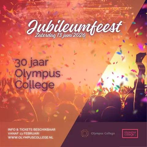 Op zaterdag 13 juni 2026 organiseert het Olympus College een jubileumfeest. We vieren dit schooljaar ons 30-jarig bestaan met onze oud-leerlingen en (oud)-medewerkers op het Olympus College festival. Dus ben je ook een leerling geweest of collega, kom dan dit mooie moment met ons vieren!