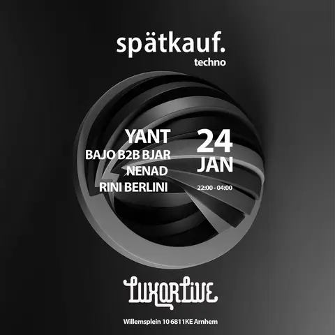 Na een succesvolle eerste editie is Spätkauf terug: het spraakmakende techno evenement met edities door heel Nederland en boekingen bij Awakenings, Rotterdam Rave en Soenda strijkt in januari weer bij ons neer! Line-up: YANT (UK) Nenad Bjar & BAJO Rini Berlini Ditmaal pakken ze wéér uit met de Engelse DJ en producer YANT. Onder andere bekend van sets bij HÖR, Berghain en diverse masterclasses in muziekproductie, komt YANT speciaal voor deze editie vanuit de UK naar Arnhem voor een avond vol techno en hardgroove. De avond zal gesupporterd worden door Nenad, o.a. bekend van techno concept De Fusie in Luxor Live waar al eerder namen als Stranger, Dave Clarke en Colin Benders te zien waren, lokale upcoming talenten Bjar & BAJO welke de avond zullen openen met een B2B set en tot slot Spätkauf resident Rini Berlini.